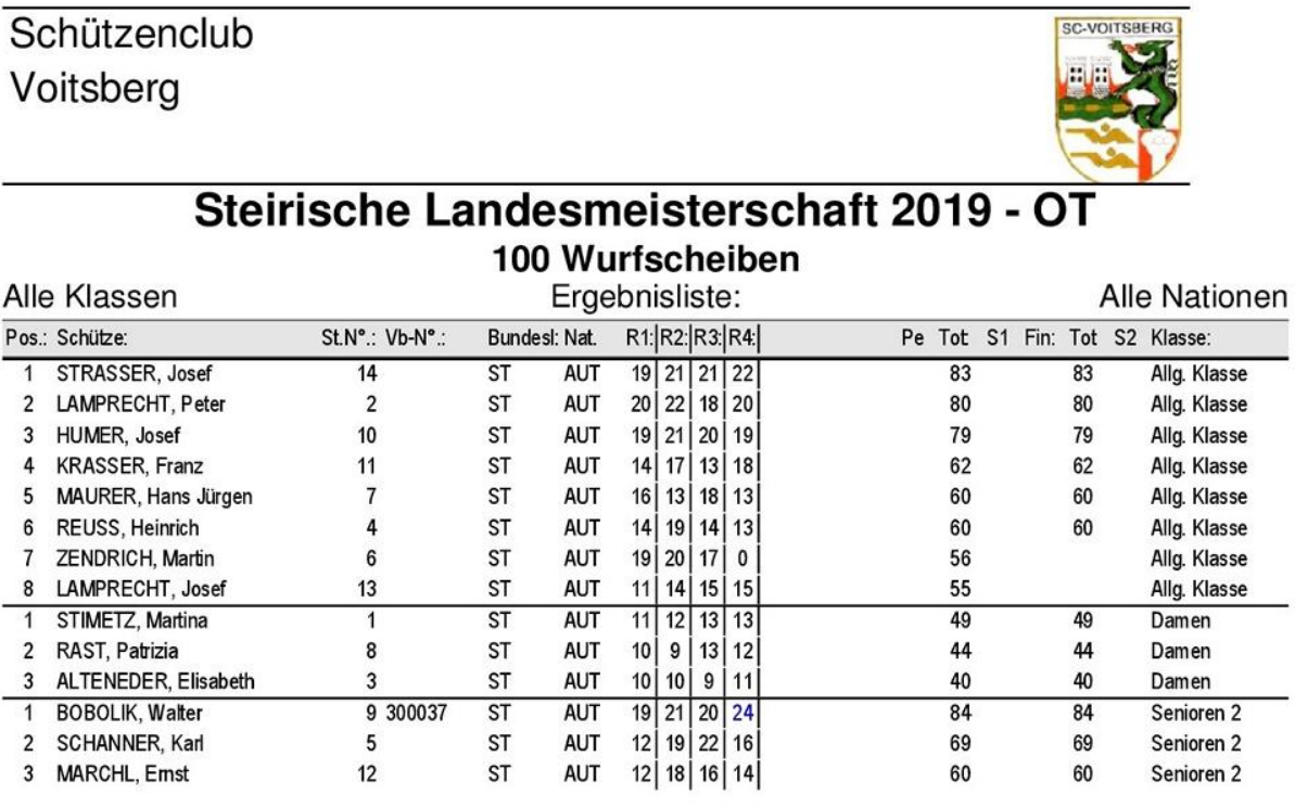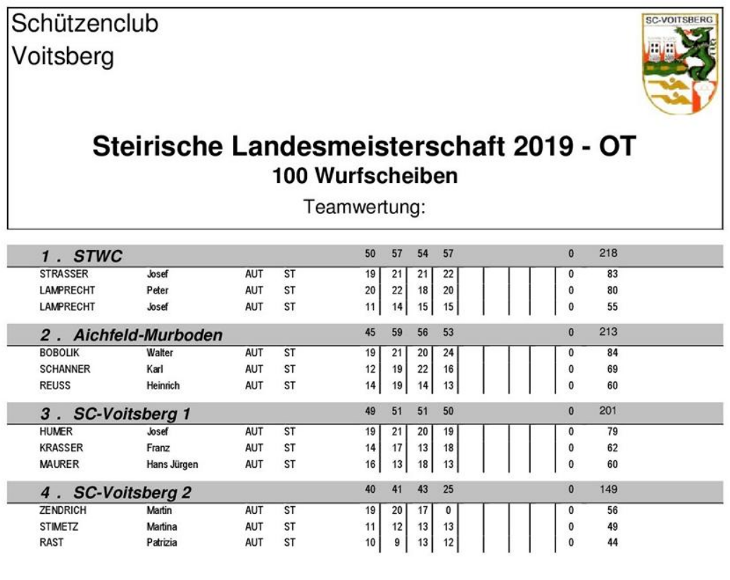 Am 17.08.2019 fand die Steirische Landesmeisterschaft - OT 100 Wurfscheiben in Zangtal statt. Nachstehend die Ergebnisse.